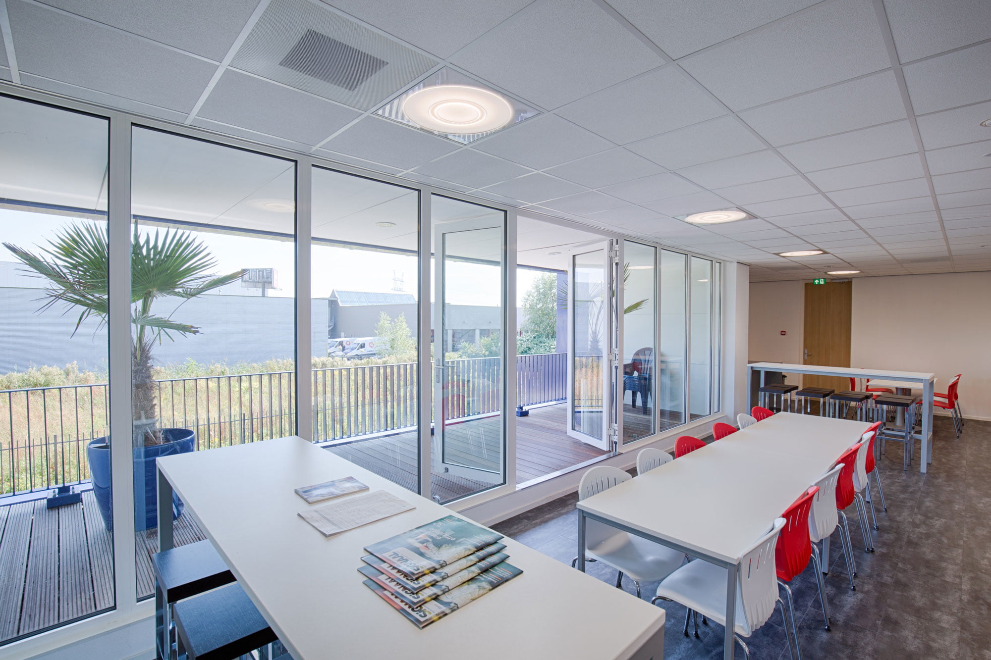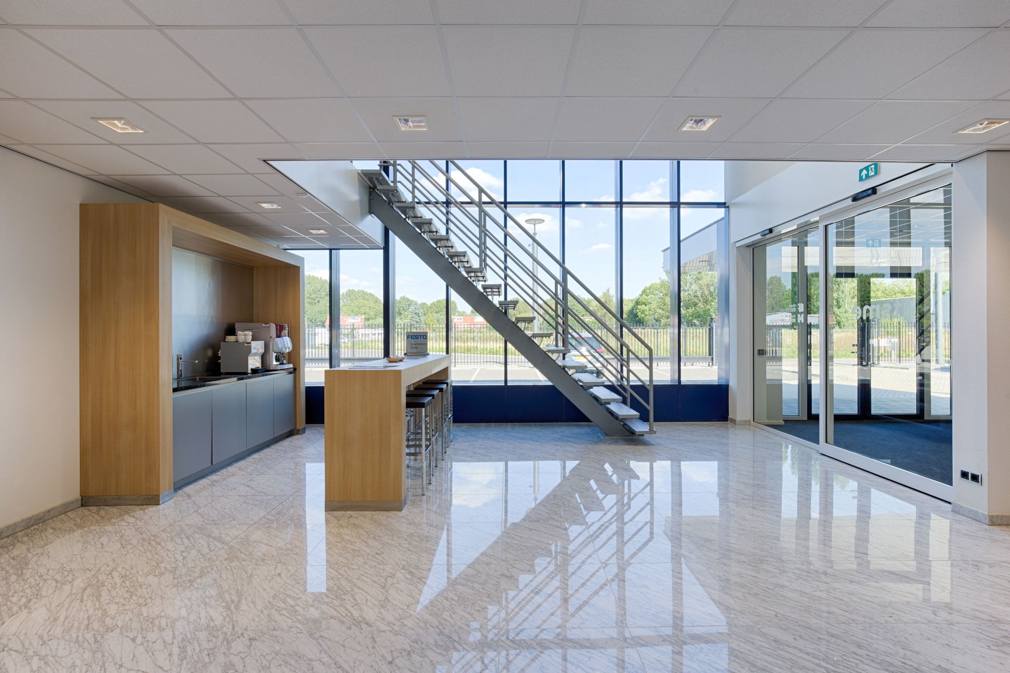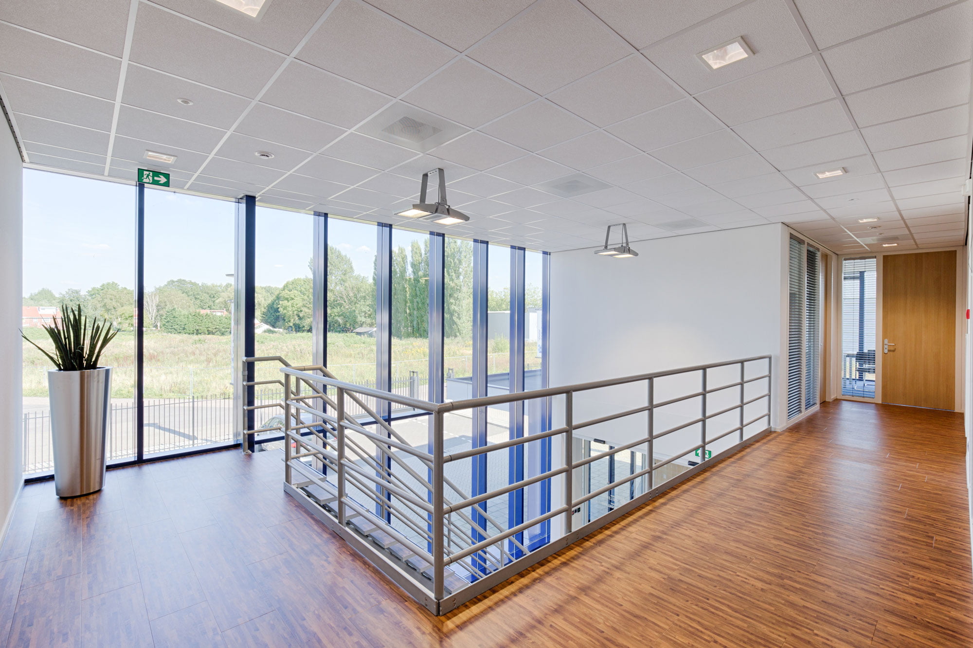 Op de begane grond bevinden zich de kantoren van ES Elektro en Hoogland-Mennens, elk met een eigen entree en een strategisch zicht op de magazijnbalie. De entreehal fungeert als verbindend element tussen de kantoren en de entree, terwijl het tevens toegang biedt tot de verdieping. Hier zijn leslokalen, vergaderruimten en de kantine gesitueerd, met aangrenzend een terras dat optimaal is georiënteerd op de zon.