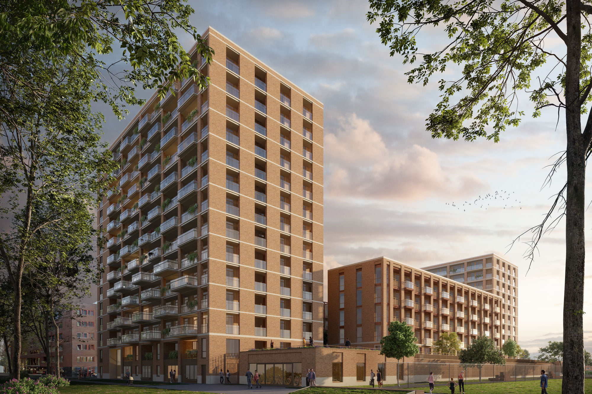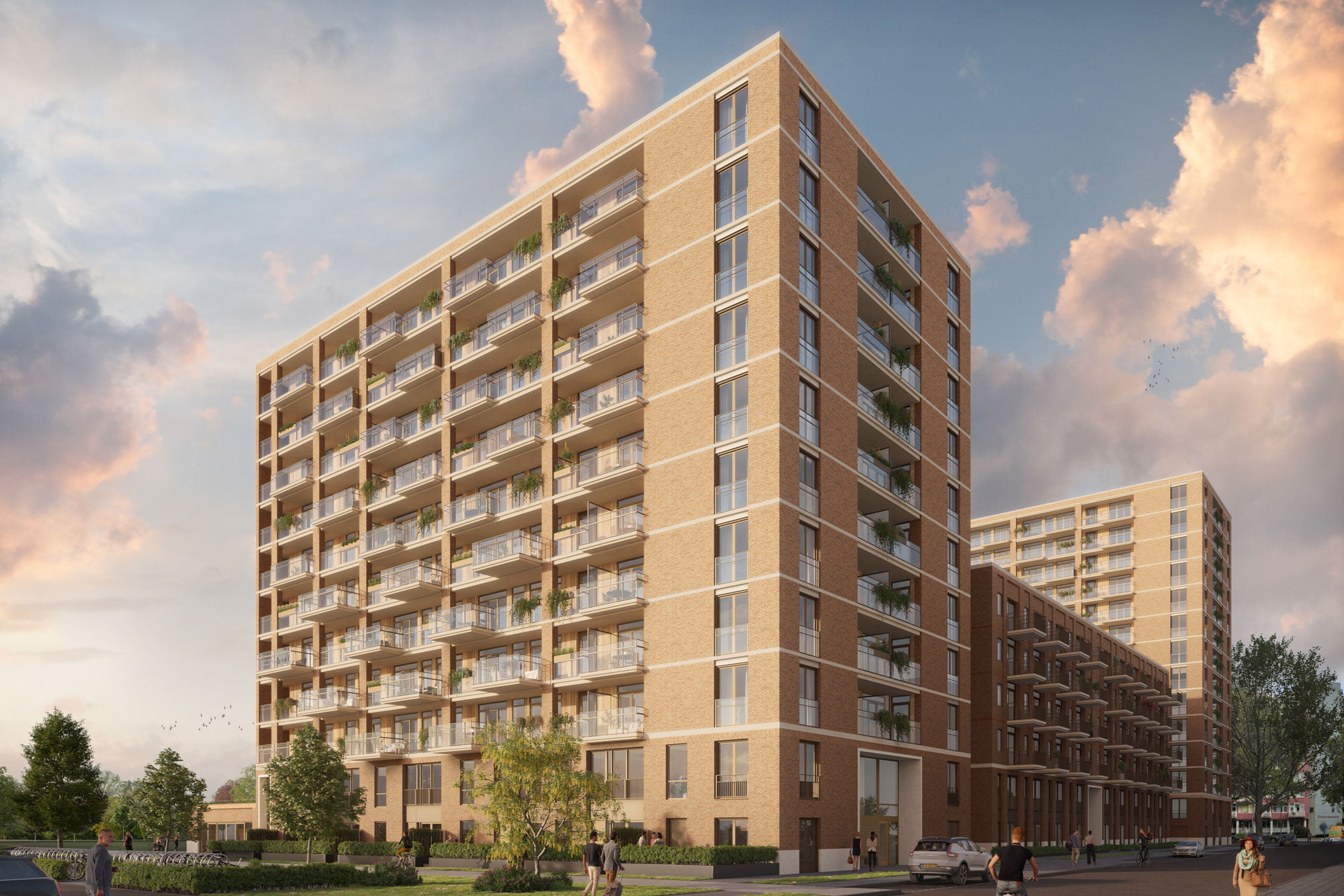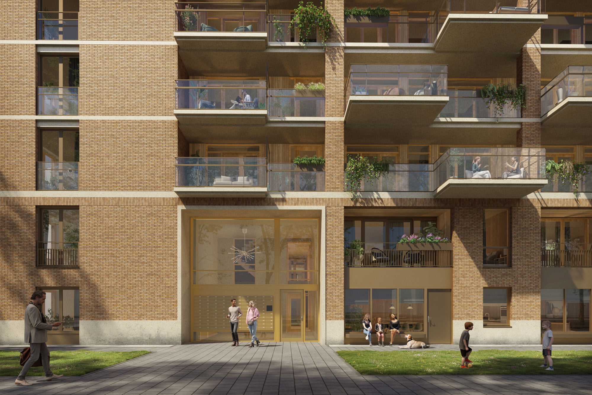 Het karakter van de strokenbouw komt naar voren in de heldere, eenvoudige hoofdvorm van de bouwblokken. De benadering van architectuur is gericht op het versterken van de verschijningsvorm vanuit stedenbouwkundig oogpunt, waarbij zowel de vormtaal als de materialisatie het concept verder tot uiting brengen. Het ensemble van de bouwblokken wordt versterkt door het bindende element van het plateau en een doorlopende dubbelhoge plint met een divers woonprogramma, waardoor samenhang ontstaat. Elk bouwblok is ontworpen met subtiele variaties in architectuur, vaak met een nadruk op een meer horizontale of verticale benadering van het gevelontwerp. Dit zorgt voor een verfijnde uitstraling en draagt bij aan de diversiteit binnen het ensemble. Het lage Land staat bekend om zijn gevarieerde kleurenpalet in de bebouwing, waarbij baksteen een veelvoorkomend materiaal is. Onze compositie bestaat uit vier stedelijke bouwblokken die harmonieus aansluiten bij de omgeving door gebruik te maken van metselwerkarchitectuur. Voor een frisse, hedendaagse uitstraling is gekozen voor een warme, beige zandtint in het metselwerk, aangevuld met accentmaterialen zoals beton en hout.