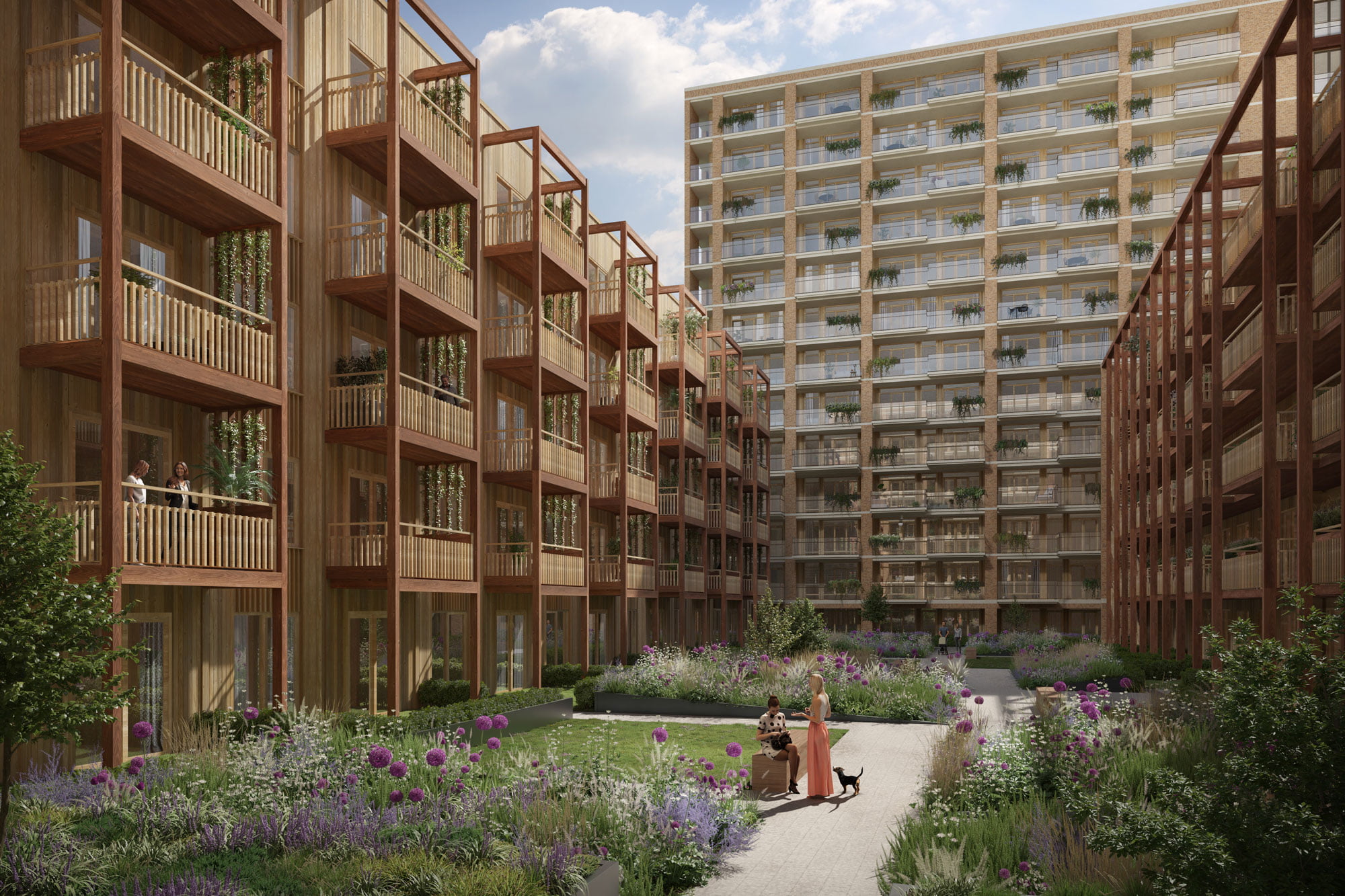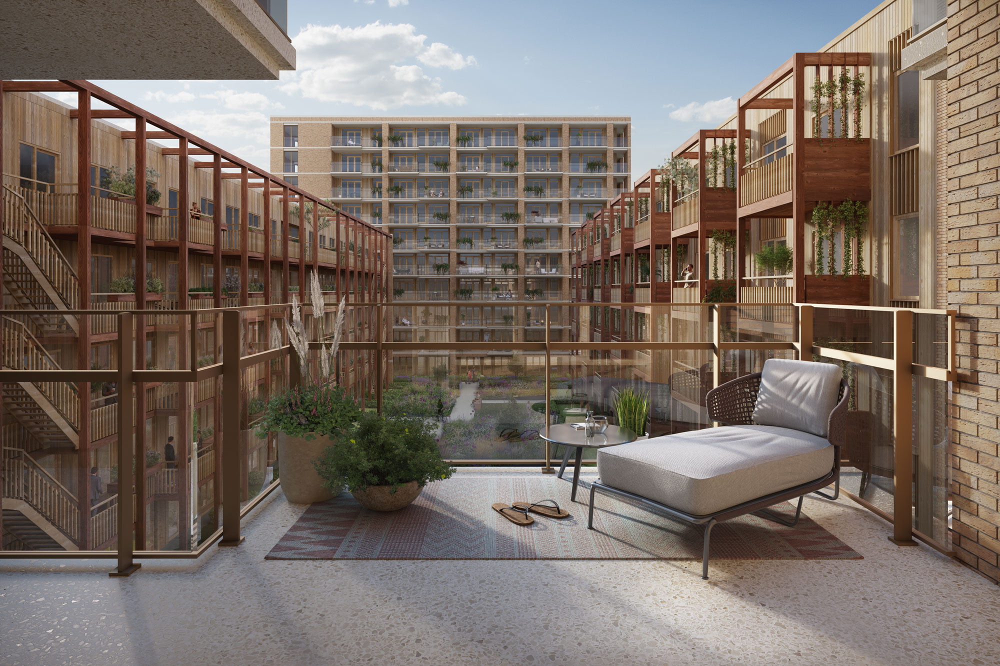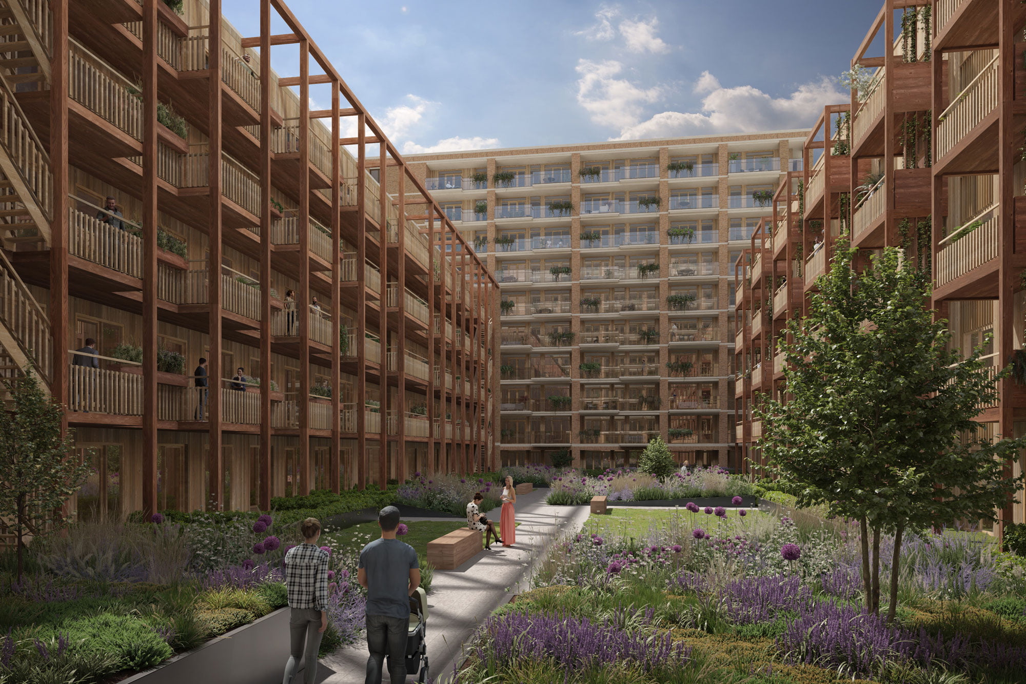 De binnentuin vormt een nieuwe wereld op zichzelf; een plek van rust en groen waar bewoners kunnen ontsnappen aan de drukte van de stad. Omsloten door houten gevels, is de collectieve binnentuin aantrekkelijk ingericht, waardoor een plezierige woonervaring ontstaat in een omgeving die bevorderlijk is voor de mentale gezondheid dankzij het groen.