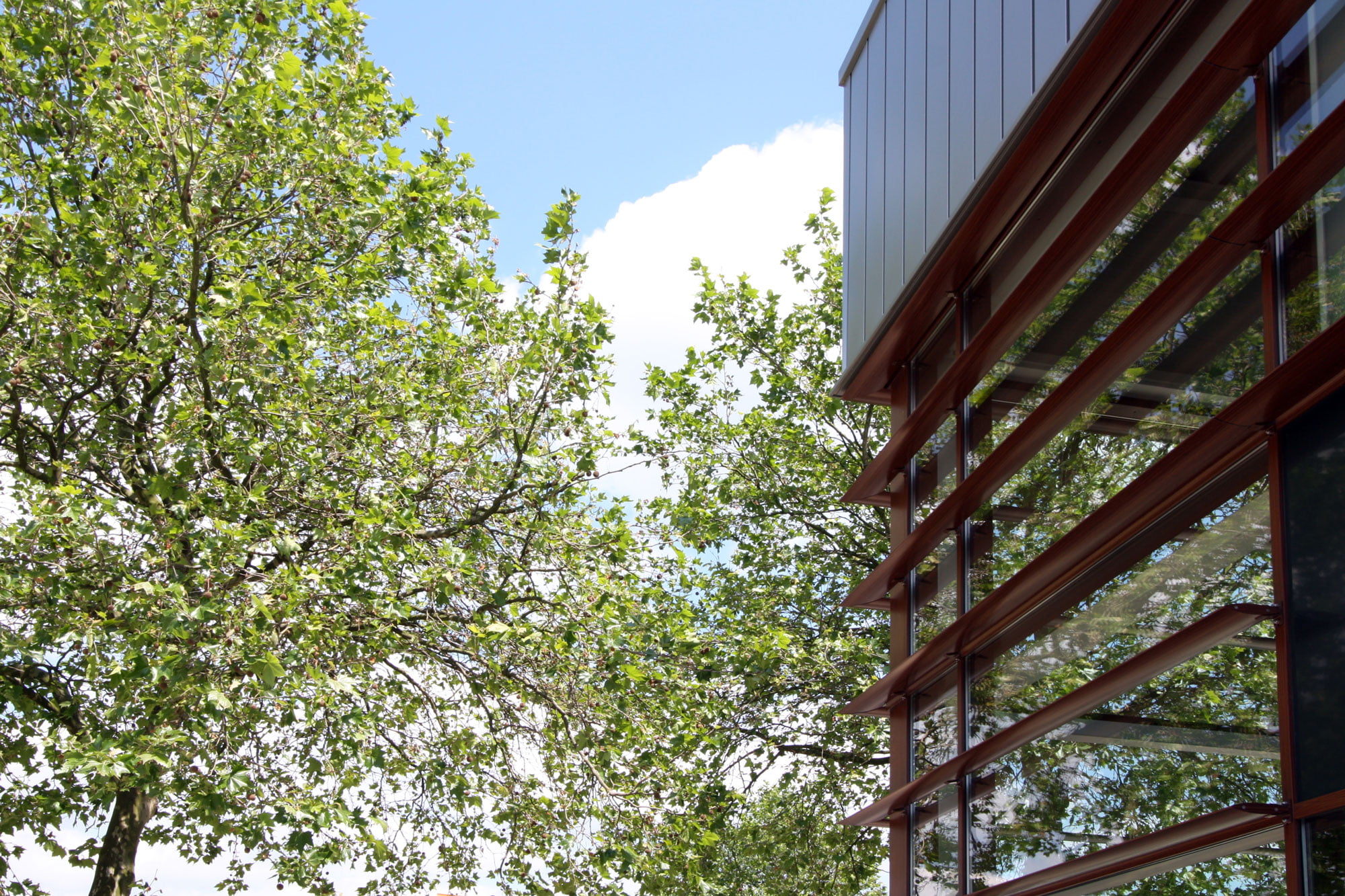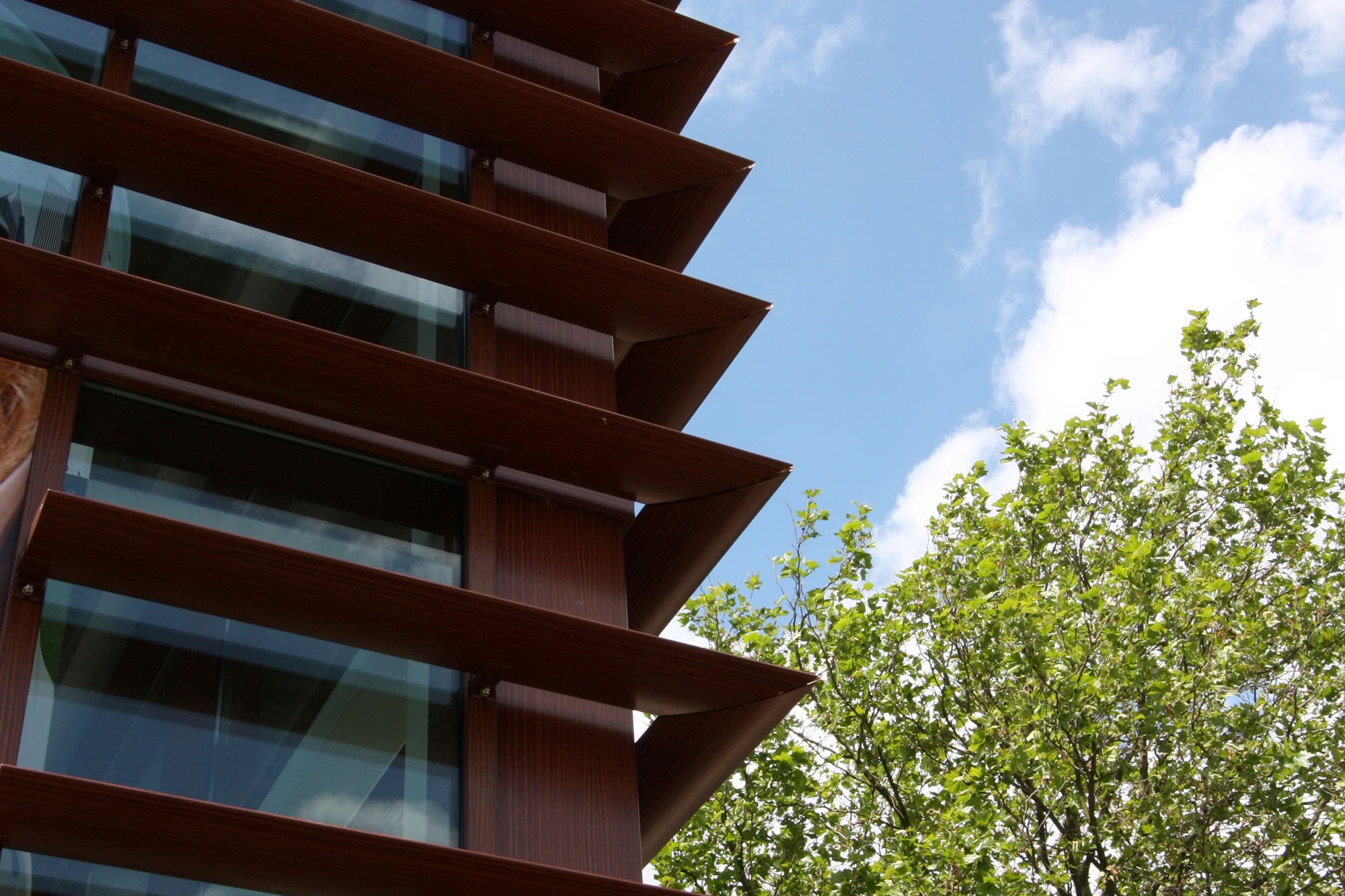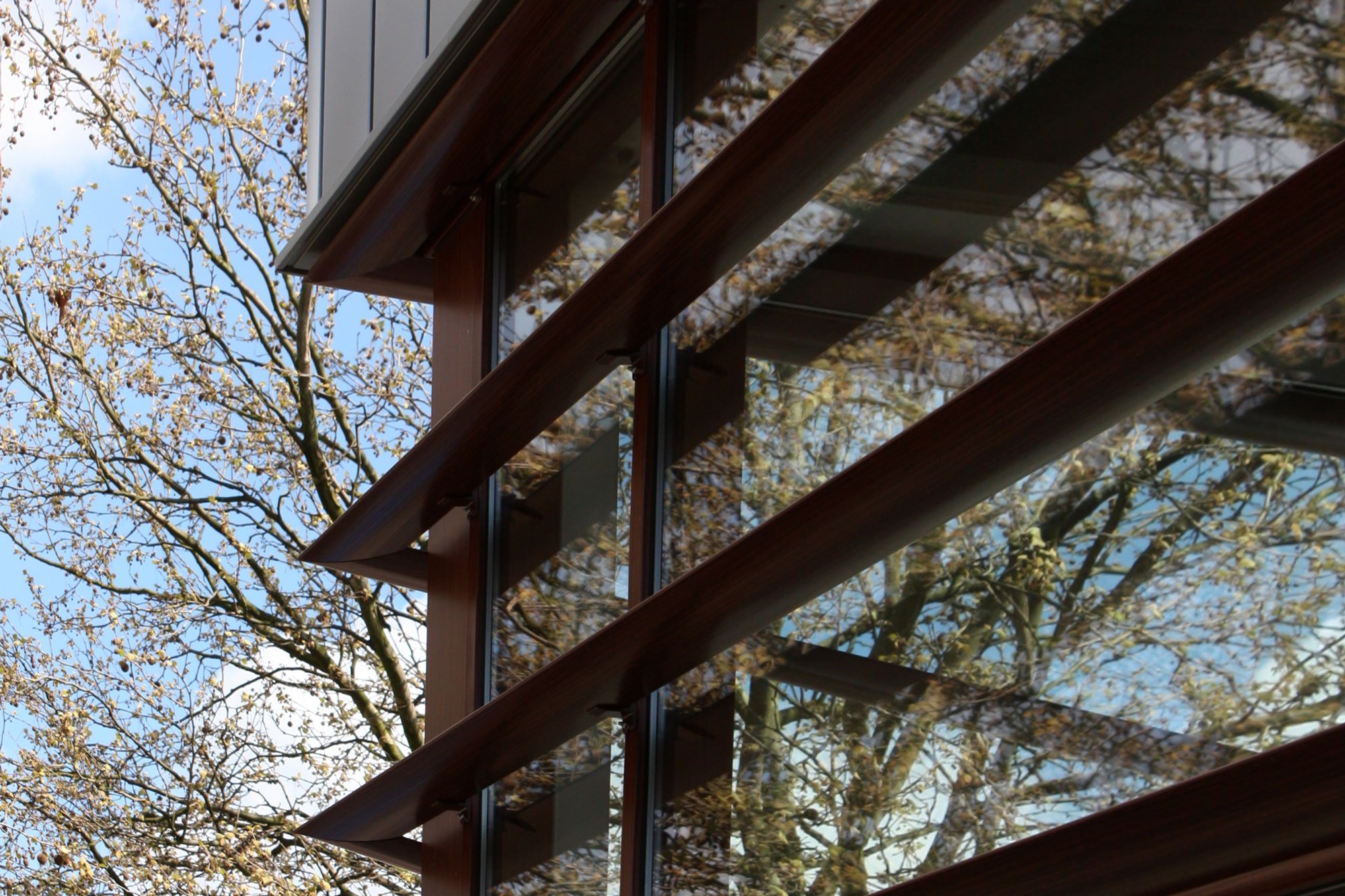 De wens voor maximale transparantie, vooral voor de showroom- en etalagefuncties, staat in contrast met de zonoriëntatie. Om dit op te lossen, zijn houten lamellen functioneel en architectonisch geïntegreerd in het ontwerp om de zonbelasting op de grote puien te verminderen. Het ritme van de lamellen wordt bepaald door de mate van zonbelasting, waardoor diversiteit en onderscheid in de gevel ontstaan. De positie van de transparante gevelopeningen is zorgvuldig gekozen om een maximale representatieve gebouworiëntatie met hoge architectonische waarde en diversiteit te bereiken. Het gebouw fungeert nu als entreegebouw voor de winkelzone Capelle XL.